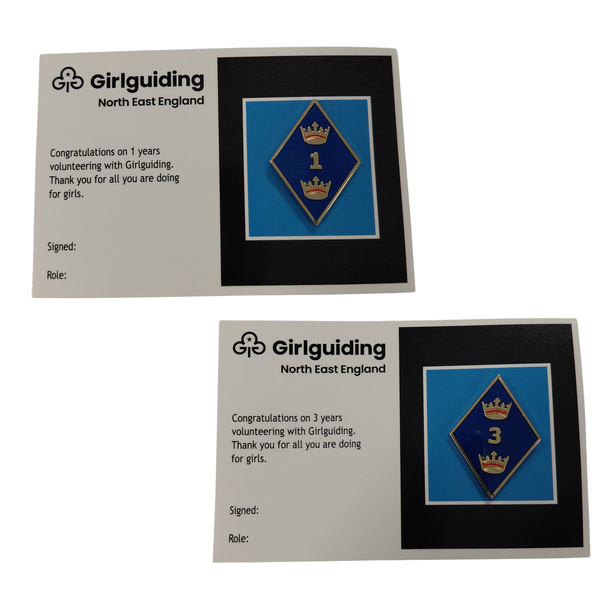 For volunteers who have completed 1 year and 3 years service. Your County may have a system for purchasing these awards for volunteers who have completed this length of service, you may wish to check with your commissioner before purchasing.